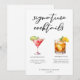 Este cartão de coquetéis de assinatura sofisticado apresenta uma simples tipografia negra acima de 2 das suas bebidas favoritas e seus ingredientes para o seu bar de casamento costeiro. Um desenho Cosmopolita Chic e Whiskey Sour adiciona um talento divertido ao seu menu de bar. Preencha com os nomes dos casais e a data para sua recepção.
