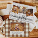 O cartão com fotos de Ação de Graças da revista rustic apresenta três fotos quadradas em um layout de colagem em um fundo de planalto de madeira leve, com "agradecido, grato, abençoado" ao longo do fundo, em letras pretas. Personalize com seus nomes, o ano e um cartões de natal (mostrado com "Feliz Ação de Graças"), e adicione uma foto adicional e uma mensagem pessoal às costas, se desejar.