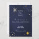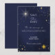 Anuncie seu amor pelas estrelas com este deslumbrante cartão de Save the Date temático Galáxia Azul. Com um cenário cósmico sonhador em tons ricos de azul-marinho e safira, detalhes de estrelas cintilantes e tipografia elegante, este design celestial é perfeito para casais modernos que desejam adicionar um toque de magia e maravilha à sua celebração de casamento. Ideal para observadores de estrelas, sonhadores e românticos.