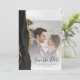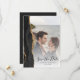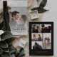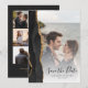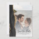 A borda esquerda deste elegante cartão moderno de "save the date" de casamento apresenta uma borda de ágata em aquarela preta com brilho dourado falso. A sobreposição de texto personalizável combina fontes de escrita à mão preta e copperplate sobre sua fotografia. O verso fornece espaços para cinco fotos adicionais (uma quadrada, três horizontais e uma vertical), juntamente com a URL do seu site de casamento ou outra mensagem em texto dourado em um fundo preto-claro. Substitua facilmente as imagens de amostra com suas próprias fotos.
