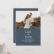 Anuncie seu dia especial com estilo com nosso Cartão de Compromisso de Data de Casamento Moderno em Azul Ardósia com Foto Personalizada. A metade superior apresenta uma foto, complementada por texto branco contra um fundo azul ardósia abaixo. A parte de trás exibe monogramas brancos elegantes em um fundo azul poeirento. Uma maneira sofisticada e personalizada de marcar a data do seu casamento.