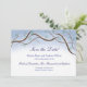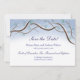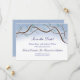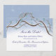 Cartão de compromisso de data plano para o conjunto de casamento Romântico Ramos de Árvore de Neve de Inverno. O design apresenta ramos de árvores aquarelados com agulhas de pinheiro formando um arco em torno de palavras em azul-marinho. Neve em um céu azul é apresentado no verso. Imagine um passeio de trenó por uma arborização de inverno.