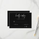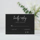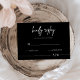 Convide seus convidados a responder com estilo com este elegante cartão de RSVP de casamento preto minimalista. Com um fundo preto elegante, letra cursiva branca moderna e tipografia limpa, este cartão de resposta complementa perfeitamente temas de casamento contemporâneos, black-tie ou monocromáticos. Personalize com seus nomes, data de resposta e opções de refeição para um toque totalmente personalizado. Combina perfeitamente com convites, gráficos de assentos e papelaria de casamento correspondentes para uma aparência coesa. Impresso em papel premium com envelopes incluídos, facilitando o envio das respostas pelos convidados.