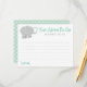 O design "Seu conselho para a Mamãe-a-Ser", do Elefante Mint green e da cinza, apresenta um adorável elefante bebê com salpicos em forma de coração, um esquema de cor verde e cinza de menta neutro em termos de gênero, e linhas em que os convidados podem preencher suas palavras especiais de conselho para a mãe. Um verde de menta pálido com padrão de bolinhas branca se veste na parte de trás do cartão.
