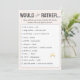 Dê aos seus hóspedes uma razão para guardarem o cartão de jogo deles! A design apresenta o jogo de chá de panela "Ela Preferencialmente?" de um lado, a foto que você dá do outro. Personalizável para esse toque pessoal, o design apresenta um fundo cor-de-rosa-champanhe com texto cor de prata. Imagem de copos de vinho picante é exibida perto do fundo. Como mencionado, inverta as características da foto que você fornece, os nomes de noiva e noivo mostrados abaixo. Claro que será um golpe no seu chá!