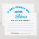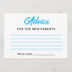 Um design de chá de fraldas de ursinho azul para os hóspedes aconselharem os novos pais. O texto é personalizável. Você pode alterar a fonte, a cor da fonte, o tamanho da fonte, o espaçamento da letra, a cor do gráfico do ursinho e reposicionar o texto usando a Ferramenta Design.