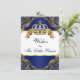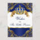O príncipe deseja um cartão de bebê com linda coroa azul real e dourada e faixa em um rico e elegante plano de fundo de espiral de ouro. Você pode personalizar este desejo real de cartão de bebê azul e ouro para o seu evento simplesmente adicionando seus detalhes no estilo de fonte e na cor de sua escolha. Você também pode adicionar uma cor de fundo. Peça aos seus hóspedes que os encham e os salve como guardião do bebê.