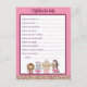 Descrição do design Um design original EXCLUSIVO por MonkeyHutDesigns. Possui um macaco de bailarina, zebra, hipopótamo e elefante, cada um vestindo um tutu. Recursos: tons do tema de cor PINK e BROWN. Perfeito para um tema de safari da selva para uma garota. Divertido jogo de chá de fraldas! Essa doce manutenção para a futura mãe e bebê da família e amigos é uma maravilhosa adição para um chá de fraldas. Este item também corresponde ao convite de chá de fraldas do MonkeyHutDesign. Todos os trabalho de arte/imagens/ilustrações/designs são direitos autorais e NÃO devem ser reproduzidos de nenhuma forma. Unicamente PARA USO PESSOAL. Artista retém direitos autorais. Todos os direitos reservados. ©2012 MonkeyHutDesigns/MonkeyHut