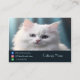 Faça uma impressão memorável com nossos cartões de chamada personalizados para sua catéria. A frente mostra uma imagem cativante de um gato, incorporando a essência do seu paraíso felino, ao lado do nome da sua cateria. No verso, encontre os detalhes essenciais de contato, como o nome, o número de telefone e o endereço do proprietário, complementados por links convenientes de mídia social para permanecer conectado. Eleve a sua imagem profissional e deixe uma marca duradoura com estas placas de chamada personalizadas, personalizadas para a sua categoria.