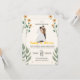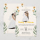 Celebre o amor com este convite de casamento doce e elegante, apresentando uma noiva e um noivo ilustrados, emoldurados por delicados acentos florais e folhagens. Os tons quentes e terrosos, combinados com uma tipografia lúdica, criam um clima charmoso e moderno - perfeito para casais que planejam um casamento relaxado, no jardim ou orientado para a família.