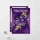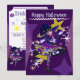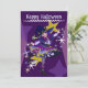 Cartão de férias roxo na frente com uma fofa bruxa neko de Halloween. No verso está o texto do convite que pode ser personalizado pelos clientes.