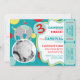 Elefante divertido de circo vestindo um chapéu de aniversário que equilibra um modelo de bola para inserção de fotos com impressão azul brilhante, azul empoeirado, vermelho e amarelo de bolinhas e rifa ao lado. Apenas perfurem os lados para uma fácil rasga!