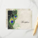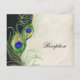PALETA DE CORES: Preto, bege, creme, dourado, azul, verde e roxo. COLEÇÃO DE DESENHOS: Convite de Recepção correspondente para recepções formais ou realizadas em local diferente da cerimônia. Esta é parte de Conjuntos de Convites de Casamento de produtos correspondentes completos. Estes Convites de Casamento de Penas de Pavão modernos e contemporâneos são modernos, elegantes e chiques. A arte é de arte original em aquarela pintada à mão por Audrey Jeanne Roberts. Há um fundo de renda texturizada, manchada de chá, envelhecida, estilizada, penas de pavão modernas e uma borda lateral de cor correspondente. No verso está o texto do convite de casamento personalizado, um conjunto de penas de pavão com floreios em espiral desenhados à mão em bege e um padrão damasco s