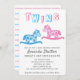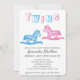 Cartão de convite para chá de fraldas personalizável de cavalo de balanço bonito. Garoto moderno e garota balançando convites para sua família e amigos. O design tem dois cavalos balançantes, um azul para um menino e um rosa para uma menina. O fundo é branco, mas você pode alterá-lo personalizando o convite.