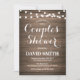 Cartão de Convite para Chás Rustic Casais com Luzes de Cordas de Fundo de Madeira. Para mais personalização, clique no botão "Personalizar" e use nossa ferramenta de design para modificar este modelo.
