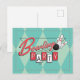 Cartão de convite para festa de boliche apresenta a tipografia "Festa de Boliche" em um logotipo retrô estilo moderno dos anos 50, com bola de boliche e pinos ilustrados. Incorporando elementos de azul, vermelho, branco e cinza, pontos e um fundo com padrão de diamantes.