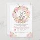 Cartão de Convite para primeiro aniversario de coelho com linda flor de peônia de rosa floral, confete de ouro e estilo de aquarela rosa.