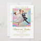 Imagem engraçada de um casal recém-casado segurando uma vassoura e uma frigideira sendo jogado após pular alegremente. Um convite para salvar o cartão de data com um toque de humor.