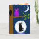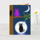 Uma coruja roxa na árvore e um gato preto em uma bola de cristal no cobrir. "Feliz Dia das Bruxas" em letras verdes emolduradas pelas folhas do outono