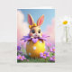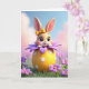 Concebido com um coelhinho estilizado e doce espiando de um ovo decorado superdimensionado, este cartão centra-se em grandes olhos escuros cintilantes e um pequeno sorriso virado para cima que parece um tímido cumprimento 🐰. Uma fita amarela brilhante está na sua cabeça, e bochechas rosadas aquecem a sua pelagem suave de tom pêssego. O coelhinho inclina-se para a frente como se estivesse a partilhar um momento privado com o espectador, adicionando uma proximidade suave e amigável à cena. Ao seu redor, pétalas roxas estratificadas formam uma espécie de cápsula em forma de flor, abrindo-se como um buquê em torno do personagem 🌷. Por baixo, uma forma de ovo amarelo solar está pontilhada com pequenos pontos brancos e repousa sobre um canteiro arrumado de relva verde rica. Qualquer texto de saudação fica perto