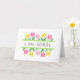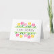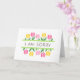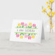 Lindo cartão de cumprimentos com tulipas cor-de-rosa e amarelas da primavera e o texto "Peço desculpas"