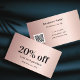 Um fundo metálico de aparência fuax rosa-dourado, cor-de-rosa, texto preto Na frente: Adicione desconto. Voltar: Personalize e adicione seu nome, endereço, número de telefone, email, endereço de site, código qr ao site ou conta de mídia social.