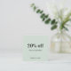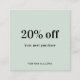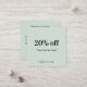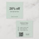 Plano de fundo verde Sage, texto preto Na frente: adicione desconto. Voltar: Personalize e adicione seu nome, endereço, número de telefone, email, endereço de site, código qr ao site ou conta de mídia social.