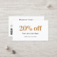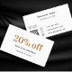 Fundo branco, ouro e texto preto. Na frente: adicione desconto. Voltar: Personalize e adicione seu nome de empresa, número de telefone, email, endereço de site, código qr ao site ou conta de mídia social.