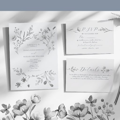 Compartilhe todos os detalhes importantes do seu casamento em estilo com este cartão elegante. Apresentando delicados florais prateados de aquarela e roteiro serif limpo, é a adição perfeita a qualquer suite moderna de boho ou casamento no inverno. Use-o para incluir informações do site RSVP, instruções de recepção, acomodações ou detalhes do código de vestimenta.