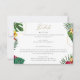 Cartão com design tropical, palmeiras, loral amarelo e vermelho e geometria dourada.