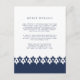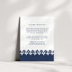 Projetado para coordenar com a nossa coleção de convites para casamento árabes inspirada em Marrocos, este cartão simples e chic contém marinho de letras azuis acentuadas com um marinho e uma borda geométrica branca ao longo do fundo. Substitua o texto da amostra pelos detalhes chave da sua celebração do casamento. Que informações incluir em um convite de casamento? Considere detalhes como acomodações de hotel, códigos de grupo, transporte, instruções, informações de recepção de boas-vindas e sua URL do site de casamento. Você pode até fazer upload de um mapa para o lado inverso usando a função personalizar. Precisa de ajuda com o texto ou a formatação? Eu adoraria ajudar! Entre em contato com Kristen através do link "pergunte a este designer".