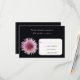 Este maravilhoso cartão de devolução RSVP de casamento apresenta uma flor gigante rosa e branca de margarida de gerbera em um fazer de fundo preto impressionante para um cartão de devolução de margaridas RSVP floral único e adorável para o seu casamento. Direitos autorais