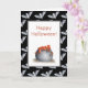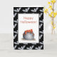 Cartão de Dia das Bruxas bonito e único com cozinhar de caldeirão e poção laranja. O fundo é preto com pequenos morcegos. O texto é personalizável, você pode adicionar seu próprio texto ou deixá-lo dizendo "Feliz Dia das Bruxas". Ilustrada e projetada por Patricia Alvarez.
