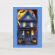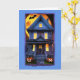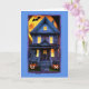 Este cartão de Dia das Bruxas apresenta uma velha casa vitoriana assustadora iluminada por uma lua de cheio brilhante no fundo. A casa, com seu exterior rachado e decadente, exude uma atmosfera estranha com suas janelas amarelas brilhantes, como se algo sinistro escondesse dentro. Na varanda está uma figura de esqueleto ameaçadora, adicionando uma camada extra de susto à cena. O primeiro plano é acentuado por duas lanternas entalhadas com rostos malignos e brilhantes, que valorizam o espírito do Dia das Bruxas. A fronteira do cartão é uma combinação divertida de pontos roxos e azuis, que contrasta com o tema assombrado, criando um design divertido e vivo. Na parte inferior da carta, lê-se "Feliz Dia das Bruxas" em uma fonte arrojada e roxa com um ligeiro efeito sombra, dando-lhe uma aparência tridimensional. Este cartão é perfeito para qualquer pessoa que queira enviar uma saudação clássica, mas divertida, do Dia das Bruxas com um toque de charme assustador.