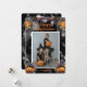 Cartão de Dia das Bruxas com jack-o-lanternas vestindo chapéus pretos e uma foto adornada com flores roxas e laranja. Personalize facilmente este belo cartão de Dia das Bruxas com a sua fotografia, o nome da família e o texto.