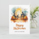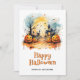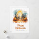 Cartão de Halloween com cemitério, jack o’lanterns, morcegos e um fantasma esquelético. Personalize facilmente este cartão de Halloween com seu nome de família e texto.