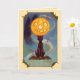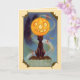 Uma cena assustadora, de fato! Esta imagem de vintage tem um gato preto com aspecto estéril sentado num morcego voador enquanto equilibra um Jack-O-Lanterna muito grande na sua cabeça.