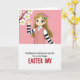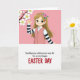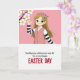 Este cartão apresenta uma pessoa ilustrada de forma amigável com grandes olhos escuros e um sorriso brilhante, seus cabelos castanhos-dourados fluindo sob uma faixa rosa no cabelo encimada por uma flor fúcsia 🌷. Eles usam uma camisa de colarinho branco sobreposta por um colete de malha cor-de-rosa e uma camisa de manga comprida listrada de preto e branco, dando um visual aconchegante e arrumado. A mão esquerda ligeiramente levantada parece um cumprimento gentil, como se estivessem saudando alguém de quem gostam com um calor fácil e afetuoso. O fundo é um rosa suave que mantém o foco na figura enquanto adiciona um brilho primaveril. Do canto superior esquerdo, um ramo fino curva-se para dentro com pequenas flores brancas de cinco pétalas e centros amarelos ensolarados, enquadrando a cena como um buquê tranquilo. Ao longo da parte inferior, um painel retangular branco contém a mensagem em letras escuras, “Enviando votos para você para um muito feliz,” conduzindo o olhar para a saudação de feriado. A linha final, “DIA DE PÁSCOA,” é
