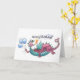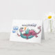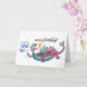 Um cartão de aniversário divertido com um dragão bonito, sorridente, rosa e verde, de uma ilustração caprichosa pintada à mão por Judy Adamson.