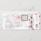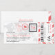 Um convite de bilhete inspirado em cartão de embarque com detalhes divertidos de carimbo de passaporte e listras de correio aéreo. Mostrado em tons de Rosa, Cinza e Preto. O verso inclui espaço extra para qualquer informação de hotel, viagem ou site.