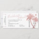 Um fim de semana de despedida de solteira em um destino de praia exige o envio de convites especiais com informações de viagem, e o design de um cartão de embarque é o mais divertido possível! Nossa palmeira rosa em folha de ouro rosa falsa acentua um convite moderno e divertido em estilo de cartão de embarque para férias na praia tropical ou fim de semana de fuga das meninas apresenta um avião rosa no canto.