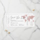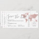 O casamento de destino com mapa mundial em ouro rosa, salva a data que parece uma passagem de avião com um logotipo de viagem de avião romântico no verso. Todos os detalhes podem ser editados para qualquer tipo de festa ou local de casamento no exterior. O esquema de cores rosa e cinza é perfeito para um tema de viagem romântica moderno e moderno.