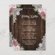 Forneça aos seus convidados detalhes importantes com este cartão de enclausuramento de casamento floral rosa rústico, apresentando flores rosa e cor-de-rosa em um fundo de madeira de celeiro adornado com renda floral branca.