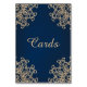 Um belo marinho azul-escura safira JEWEL TONED e cartão de número da mesa de casamento dourada com um exótico sari ornamental inspirado pela Índia MEDALLION, com um DESIGN FLORAL E LOTUS SUNBURST. Esta elegante e bela carta ao estilo indiano é perfeita para qualquer ocasião formal COM UM TEMA DE ALADDIN OU NIGHTS DA INDONÉSIA ORIENTAL. Pode ser personalizado com os nomes da noiva, noiva e data de casamento. Projetado por Chrissy H. Studios, LLC. Todos os Direitos Reservados.