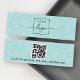 Miniplaca de exibição do produto de brinco com código QR e modelo de logotipo personalizado em uma IMAGEM de linen azul-aqua IMPRESSA. As guias de brinco podem ser ajustadas adicionando e removendo espaços no campo modelo e movendo todo o elemento na ferramenta design.