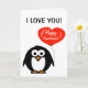 Cartão de felicitações de aniversário com pinguim fofo segurando um balão vermelho em forma de coração.