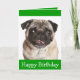 Quem pode resistir ao rosto fofo de um cachorrinho? Deixe este doce cachorrinho ajudá-lo a enviar Feliz Aniversário Saudações para a família e amigos. Este doce cartão de saudação apresenta um cachorro de Pug bronzeado e preto sobre um fundo branco com uma bonito borda verde esmeralda.