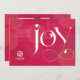 Este cartão de feriado comercial de cor brilhante apresenta um fundo vermelho magenta vívido, com a palavra "alegria" grande, com o o pendurado como um Enfeites de natal. A frente destaca o logotipo da empresa e a mensagem de gratidão. A parte traseira apresenta uma foto da empresa, um logotipo e espaço para uma mensagem adicional.