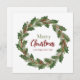 Este cartão de Natal simples e na moda apresenta uma bela coroa com folhas verdes, groselhas vermelhas e castanha castanha, cones de pinho. Além disso, uma tipografia verde e vermelha com estilos diferentes que diz "Feliz Natal e Feliz ano novo" em um fundo branco