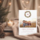 Um cartão de cartões de natal inicial da família minimalista. Este cartão de natal apresenta uma coroa verde com cones de pínus, bagas vermelhas e uma inicial no meio da coroa. Todo o texto no cartão pode ser personalizado. A foto é apenas para fins de posicionamento e pode ser substituída por qualquer foto.